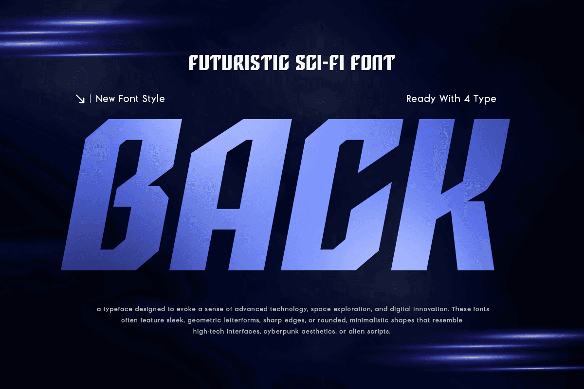 BACK is a futuristic sci-fi font crafted to bring a bold and innovative edge to your designs. With sleek and modern letterforms, BACK is perfect for: