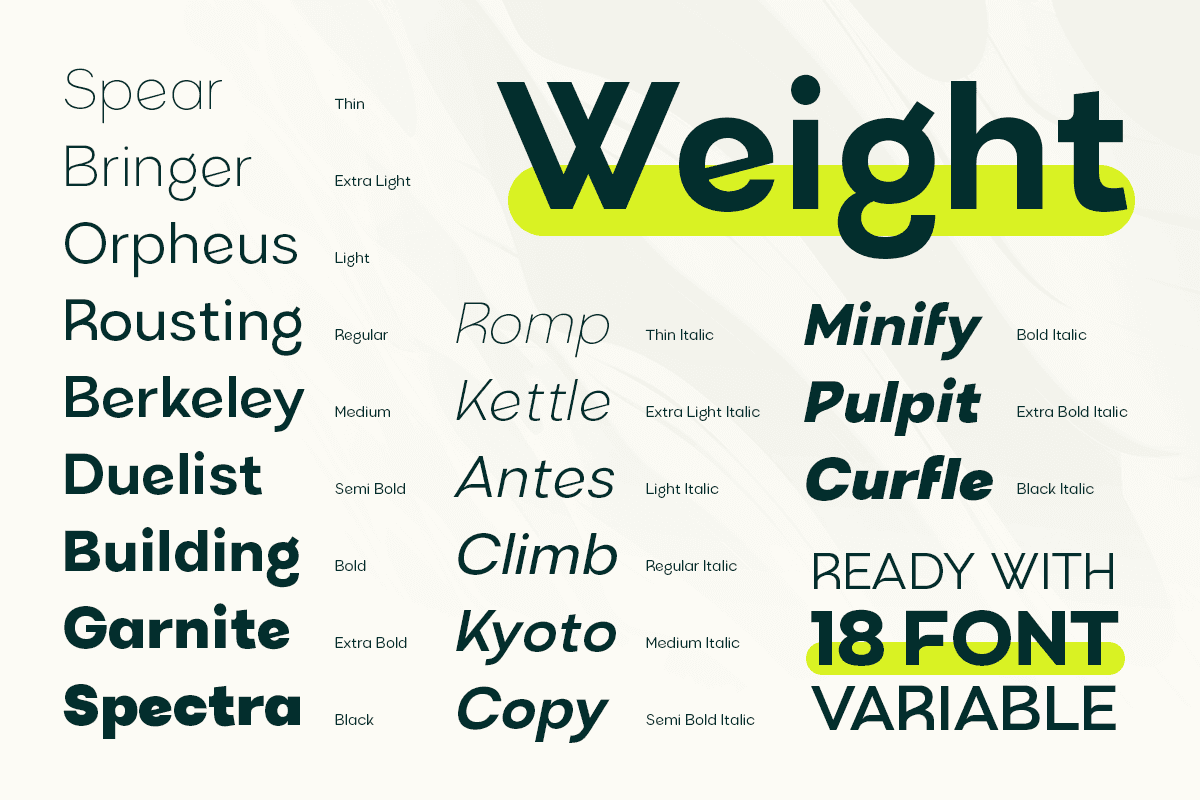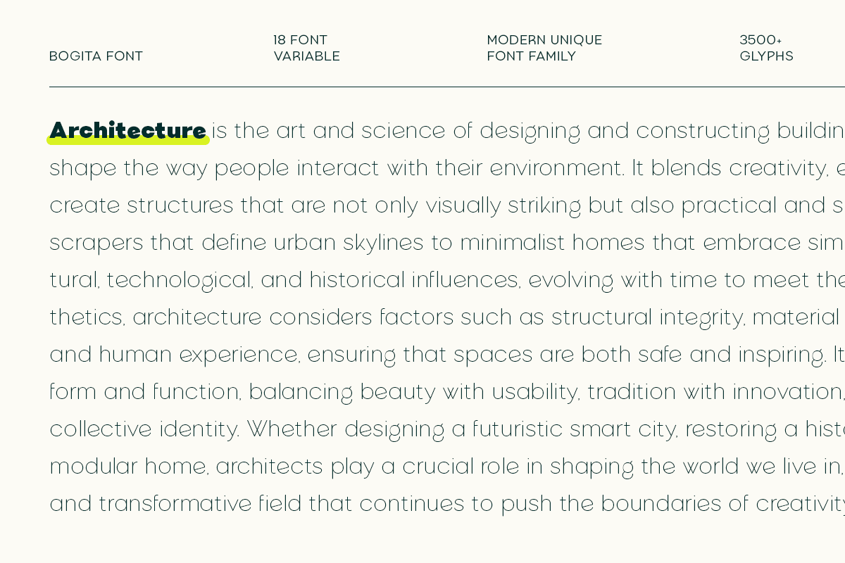 The family includes multiple weights, allowing you to build a complete and cohesive design system — from bold headlines to subtle body text. BOGITA brings versatility, professionalism, and a fresh contemporary feel, making it ideal for design studios, lifestyle brands, tech startups, and creative businesses.