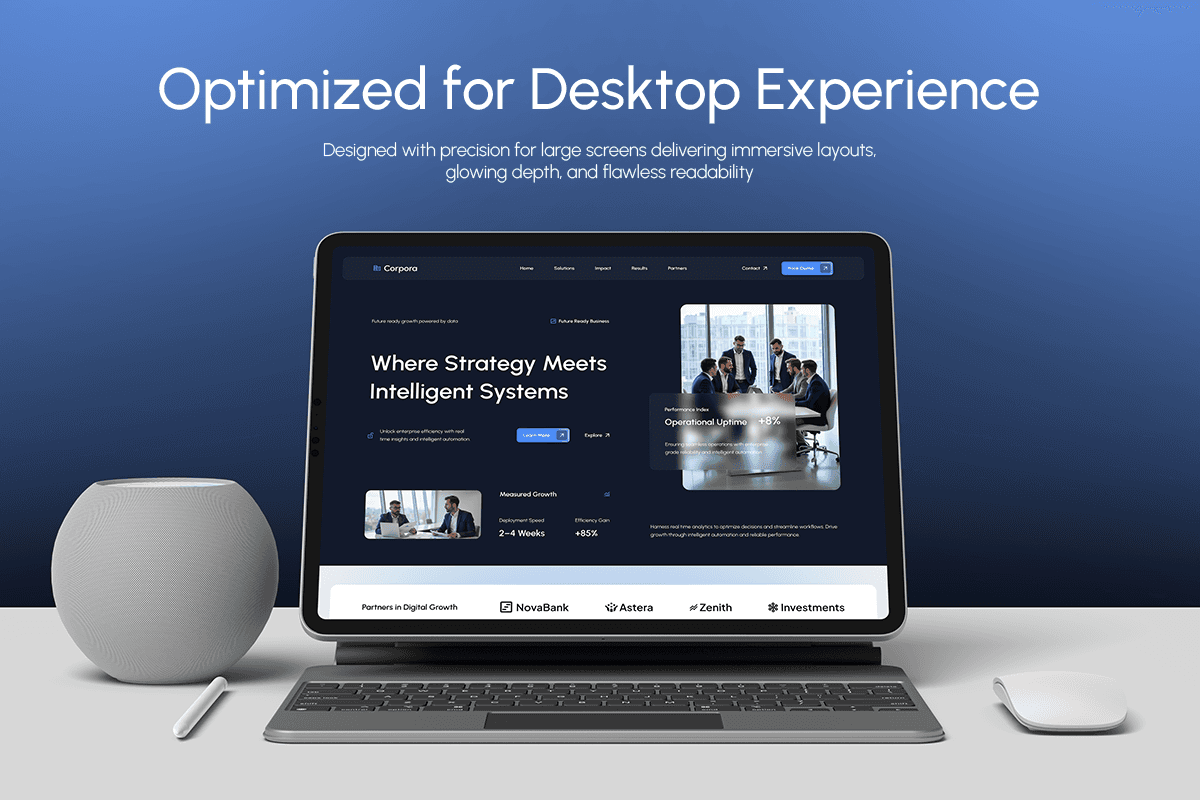 Corpora is a modern corporate business website template crafted for organizations that blend strategic consulting with advanced digital systems. With its sleek dark interface, crisp typography, and data-driven visual components, the template delivers a sophisticated presence that feels both innovative and enterprise-ready. Each section is carefully structured to communicate how your solutions drive operational efficiency, revenue growth, and real business impact through intelligent platforms and analytics.