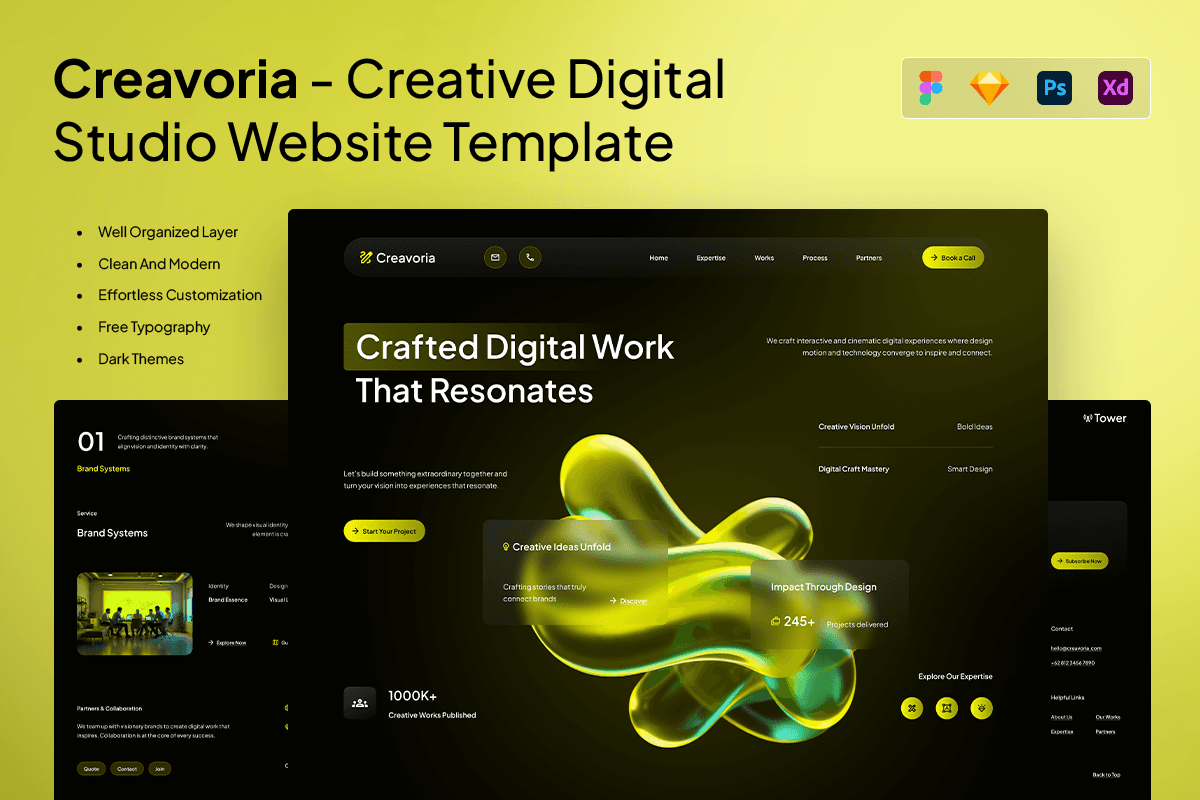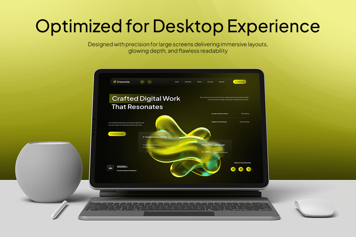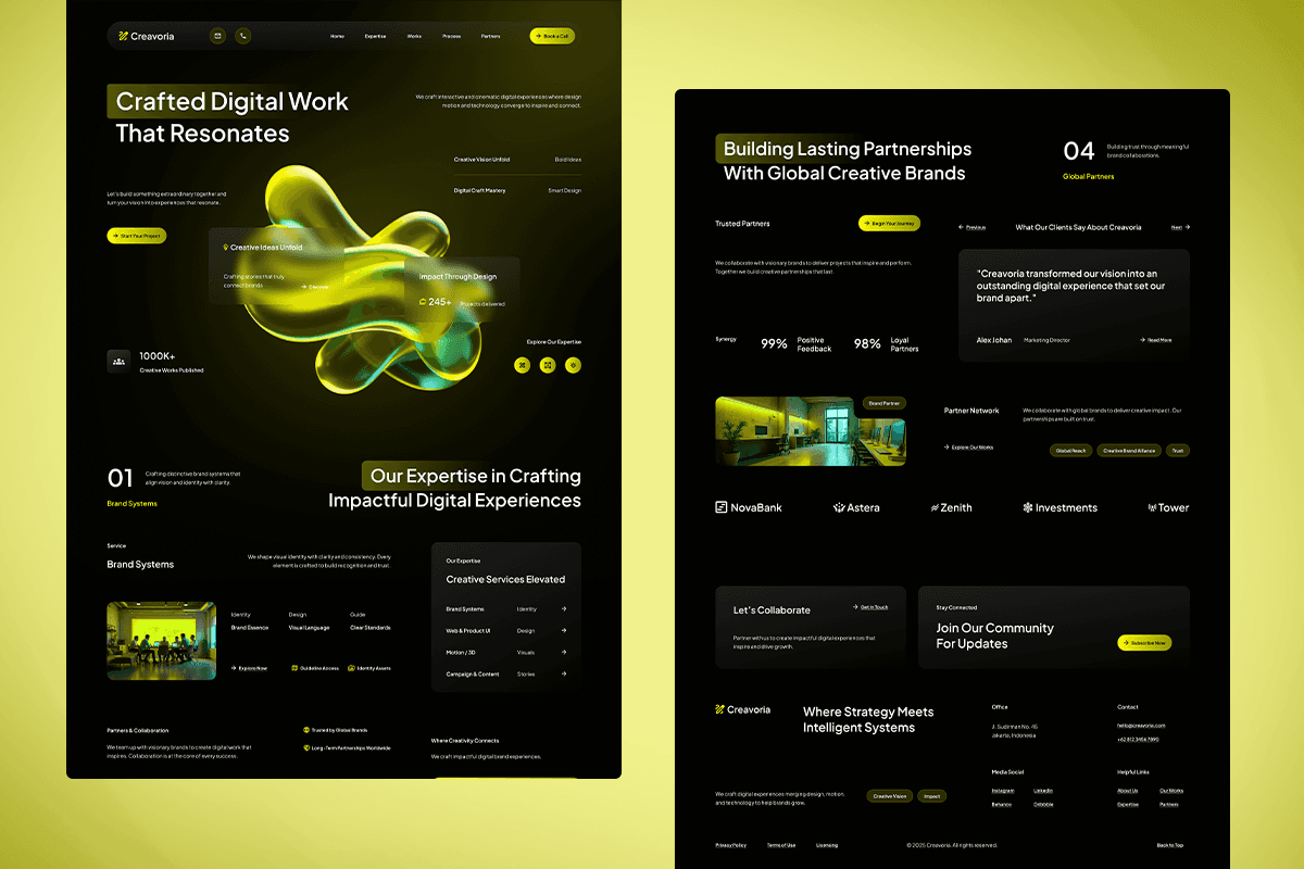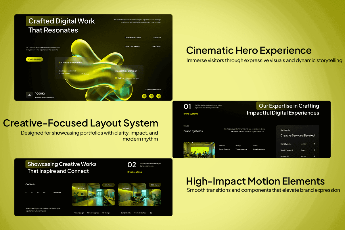 Creavoria is a striking creative digital studio website template crafted for teams that blend strategy, design, and technology into impactful digital experiences. With its dark, cinematic background, vibrant lime accents, and fluid 3D hero visuals, the template delivers a distinctly modern look that feels both artistic and professional. Each section is thoughtfully structured to highlight your expertise in branding, web experiences, campaigns, and visual storytelling—while keeping the work itself at center stage.