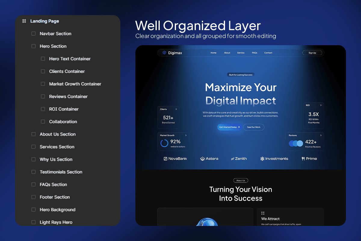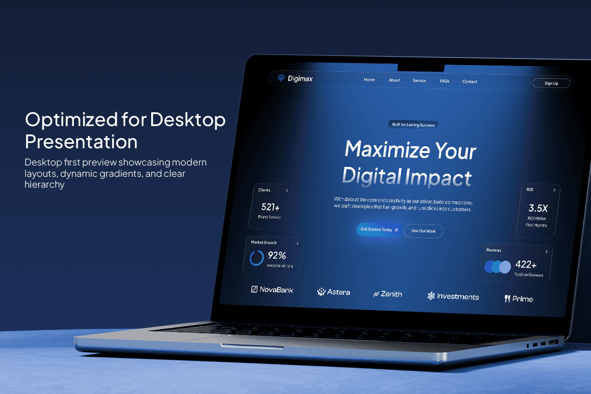 The layout is designed to guide visitors from value proposition to services, key features, proof of results, client testimonials, and FAQs—making it easier to build trust and convert leads. Its dark, modern aesthetic combined with luminous gradients and smooth hierarchy makes Digimax an ideal choice for digital agencies, growth consultants, performance marketers, and creative studios looking to elevate their online presence.
