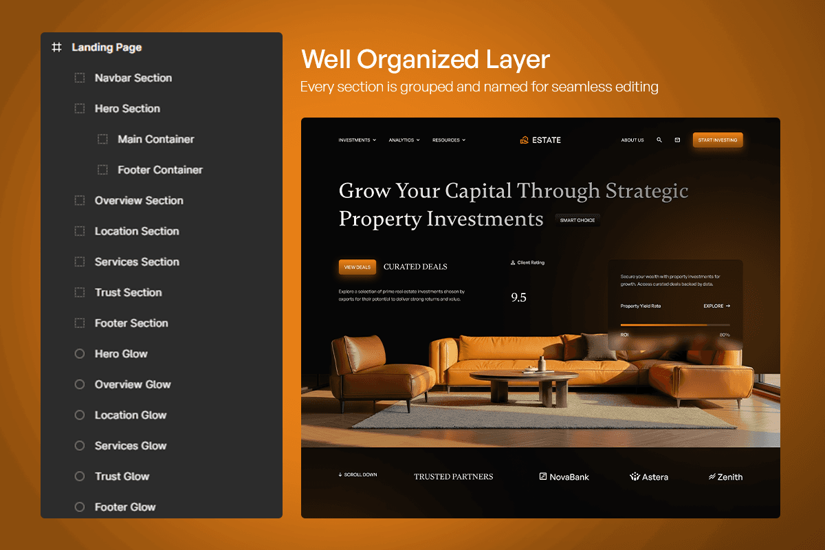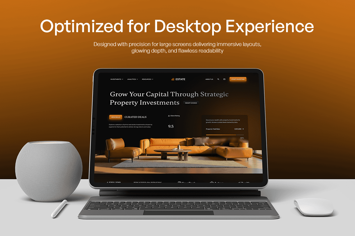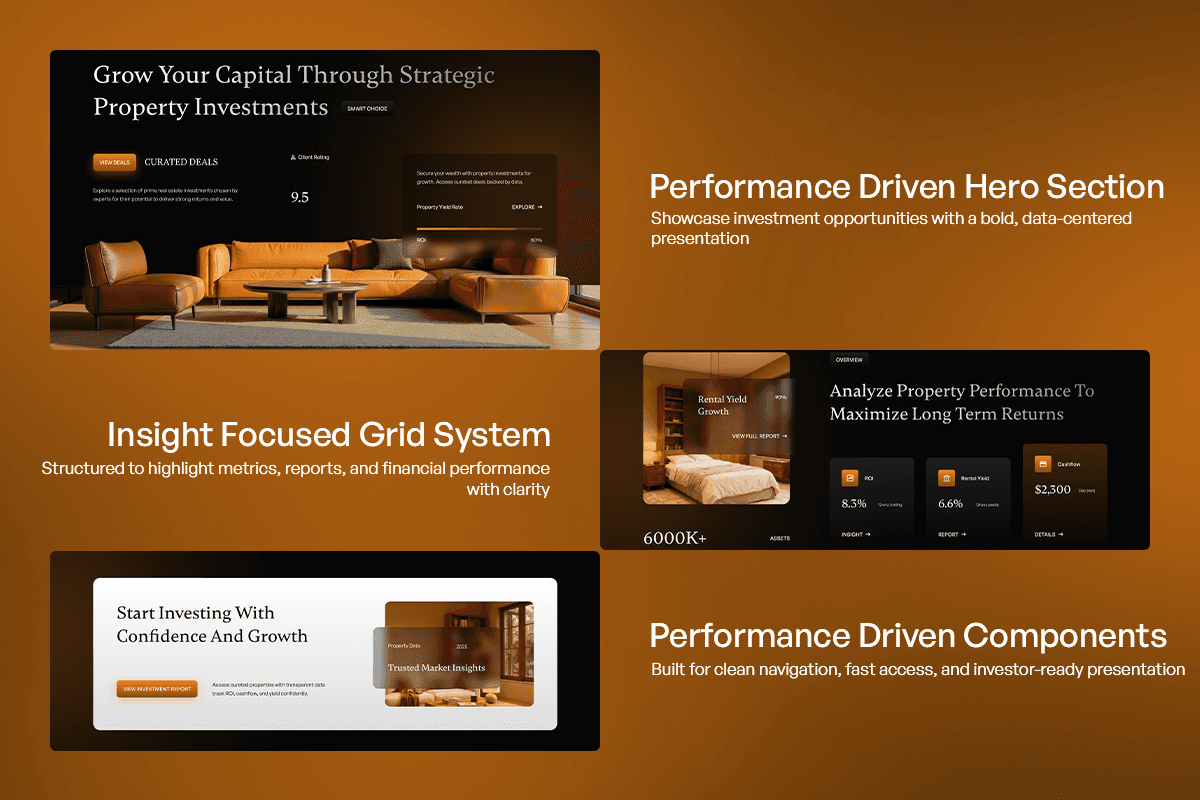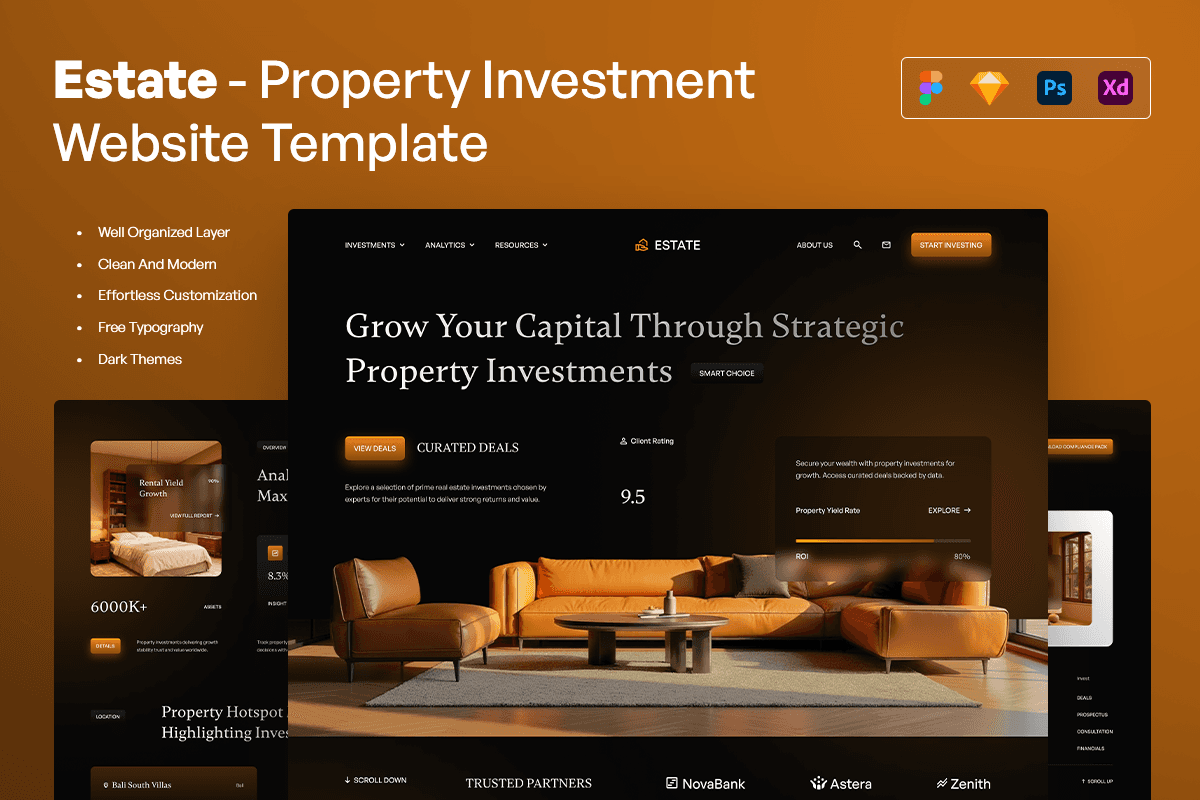 Estate is a refined property investment website template crafted for firms, advisors, and platforms that help investors grow capital through strategic real estate opportunities. With its rich, lounge-inspired visuals, clear typography, and structured layouts, the template delivers a premium experience that feels both sophisticated and highly professional. Each section is designed to guide investors through curated deals, performance analytics, hotspot locations, key services, and proven results—making complex investment information accessible and compelling.