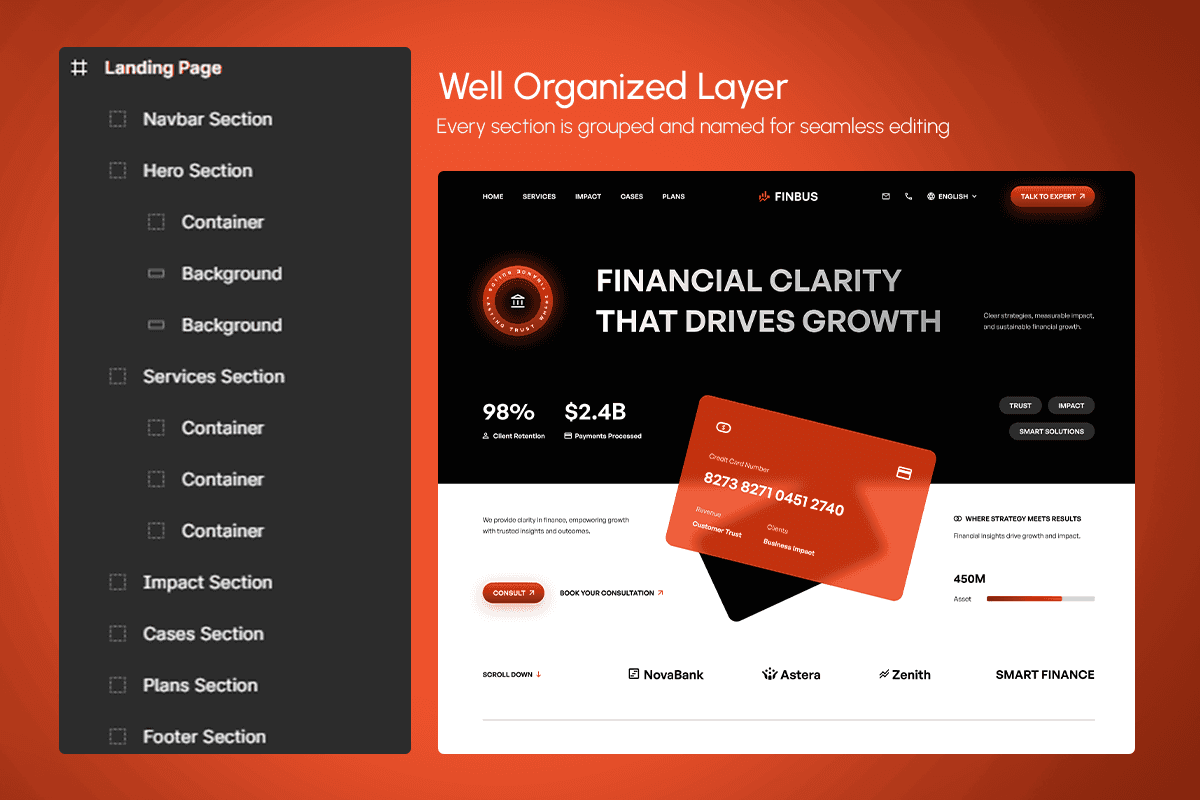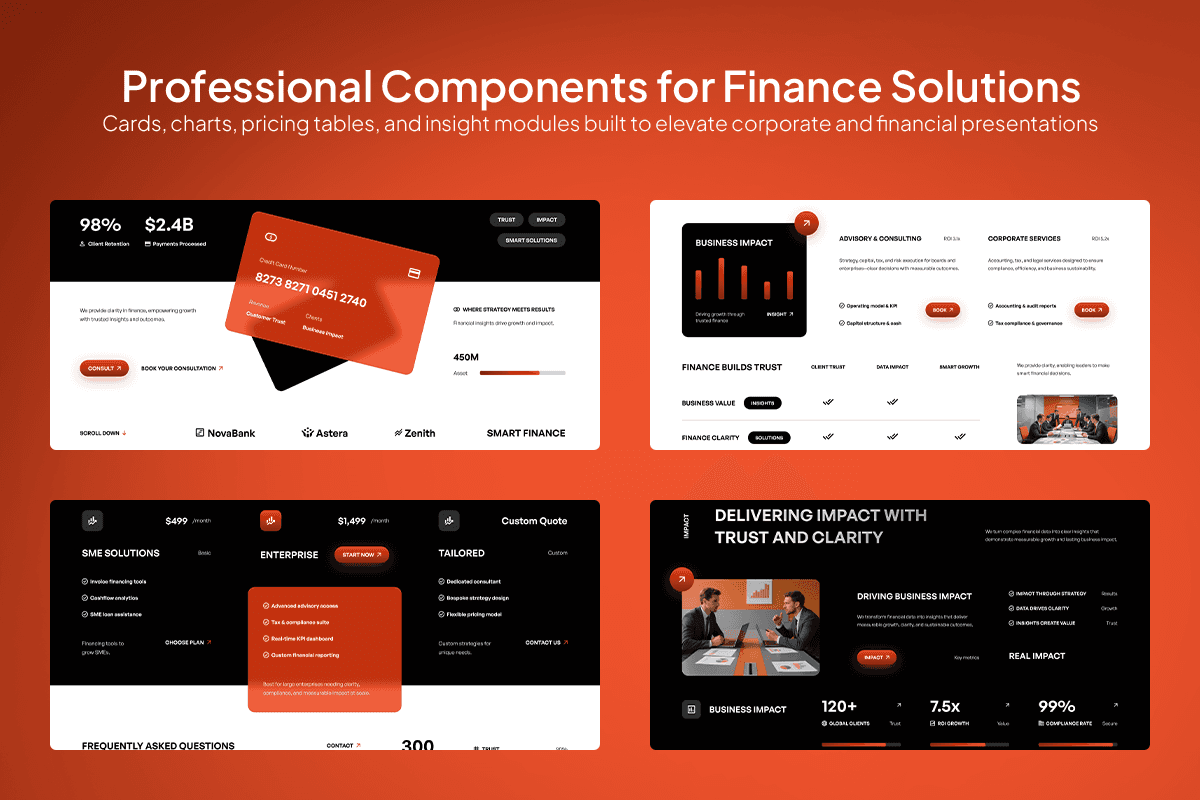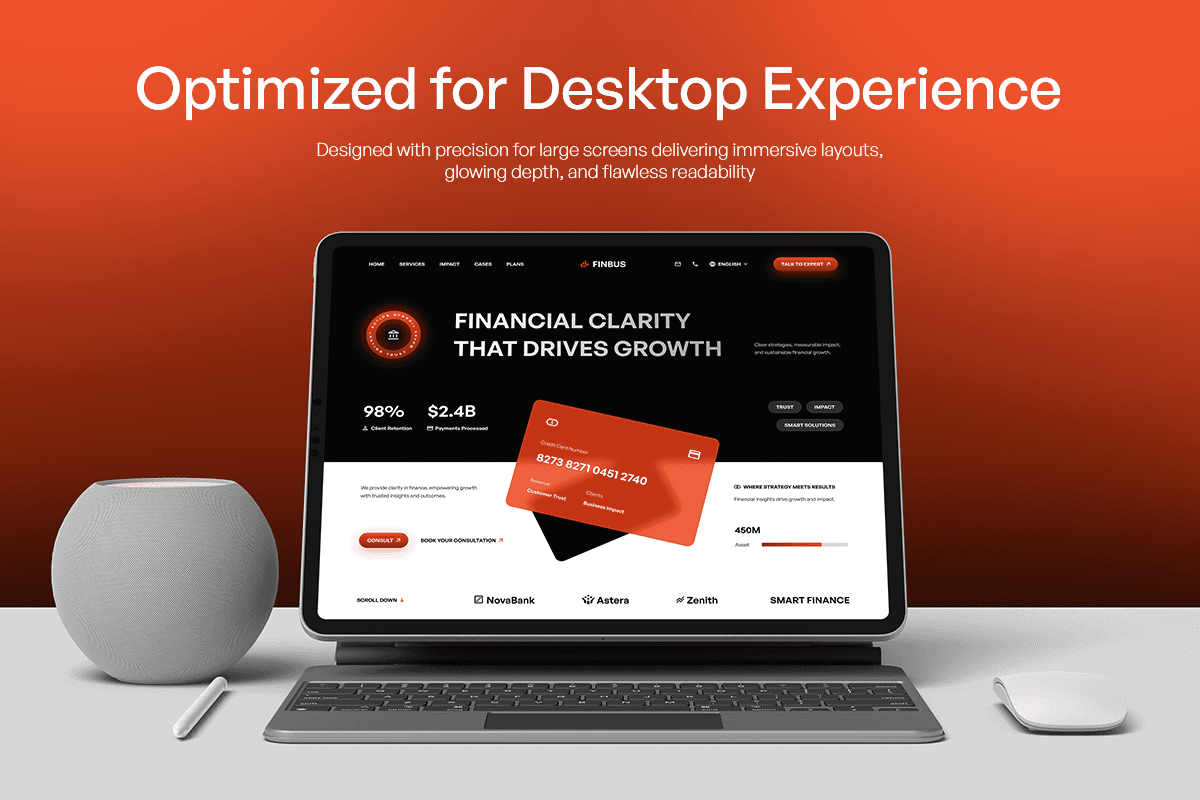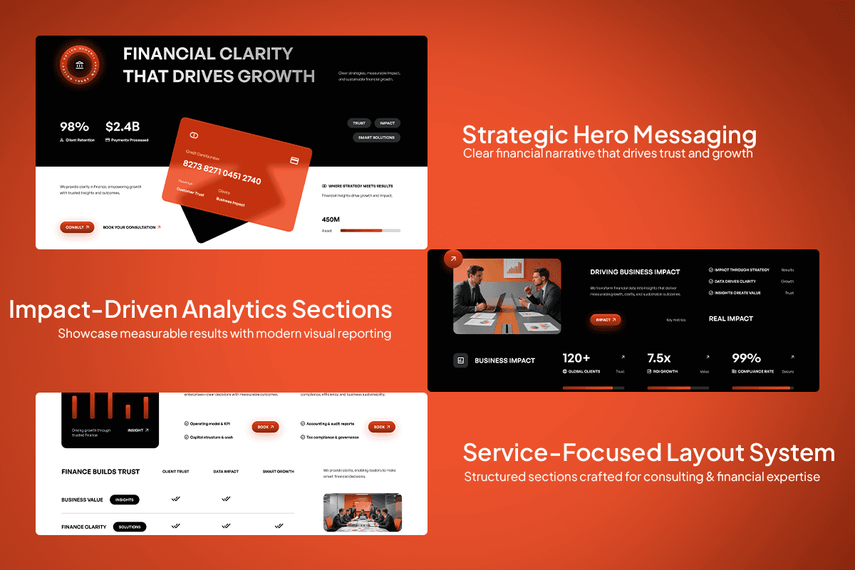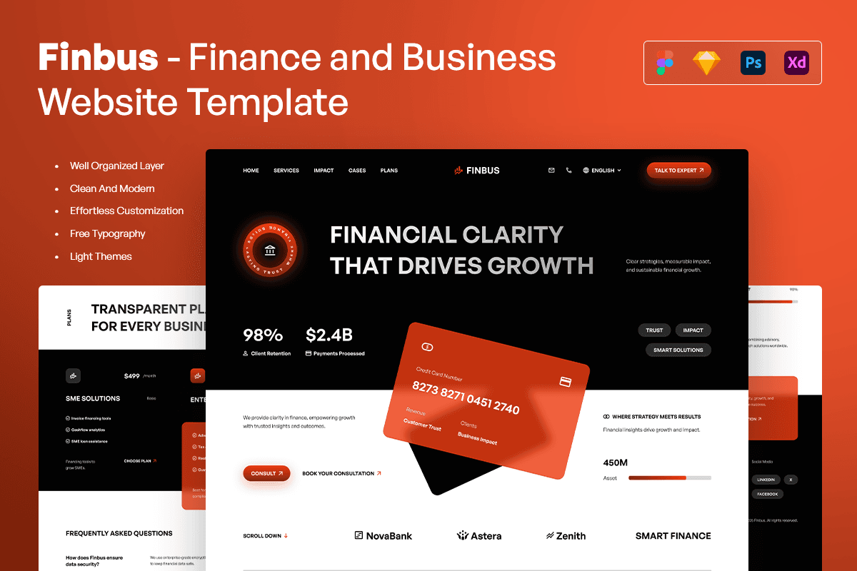Finbus is a contemporary finance and business website template crafted for organizations that help companies unlock growth through smarter financial strategies. Combining a strong dark-and-light visual contrast with striking orange accents and clean typography, the template delivers a confident, data-driven look that feels both professional and approachable. Each section is carefully structured to present advisory services, corporate finance solutions, smart payment offerings, and tailored plans—always connected to clear business outcomes.