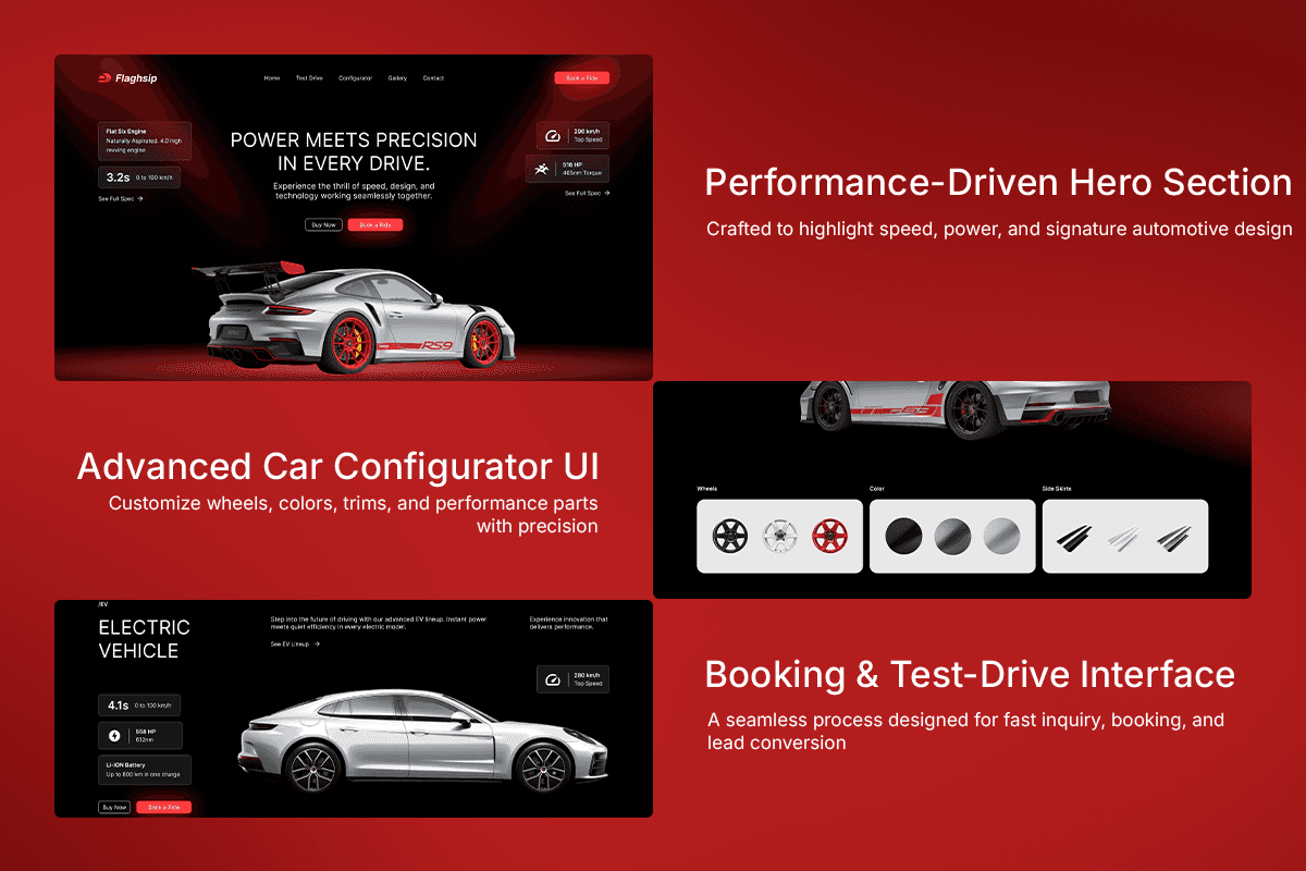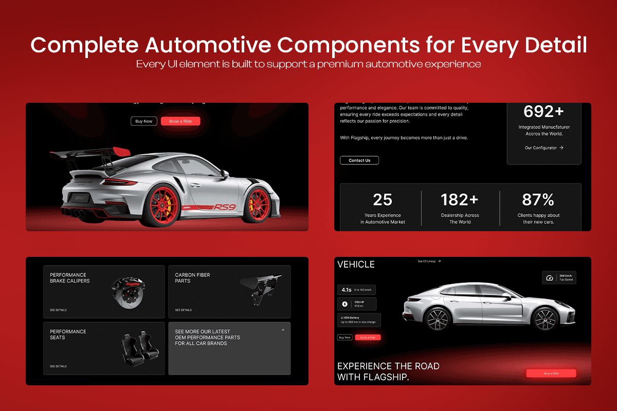 The layout guides visitors through hero performance stats, brand story, configurable luxury parts, OEM performance components, and EV highlights—creating a complete journey from admiration to action. Dedicated sections for booking test drives, customizing vehicles, and exploring product details help convert interest into real engagement. Flagship is ideal for sports car manufacturers, luxury car dealers, tuning shops, and automotive brands seeking a powerful and exclusive online presence.