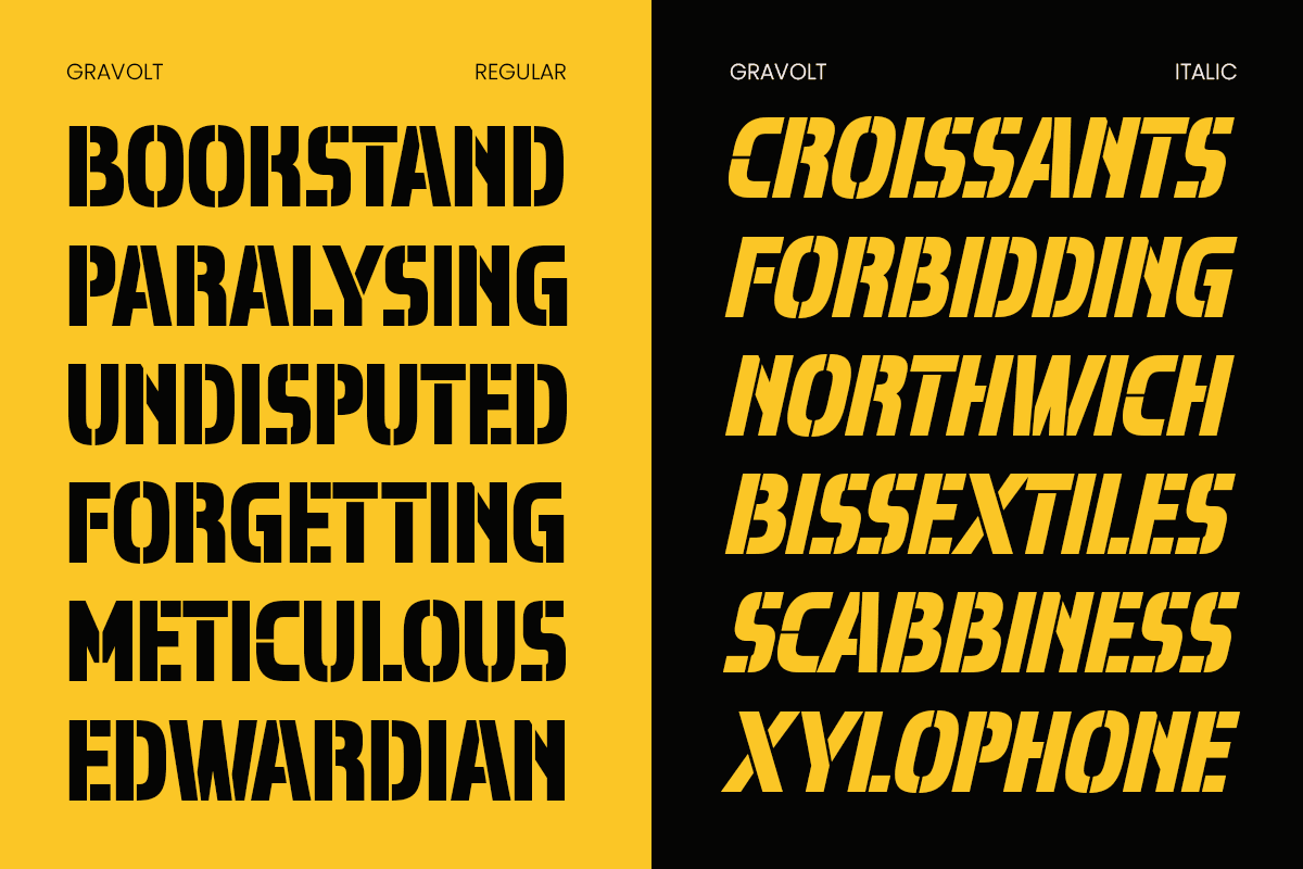 Command attention with GRAVOLT – the ultimate stencil font for military and rugged designs.