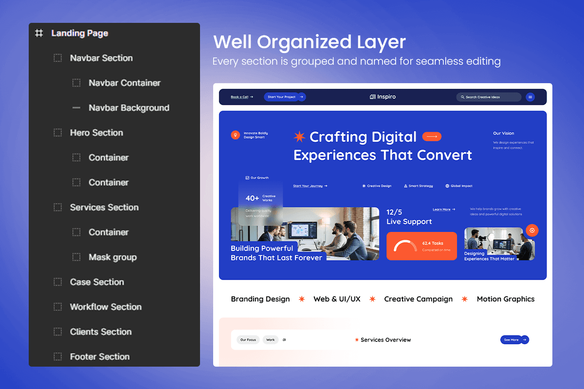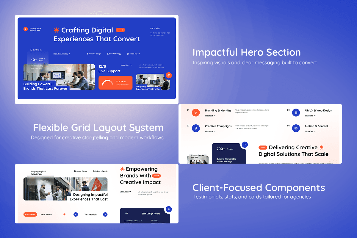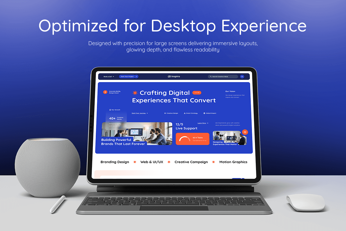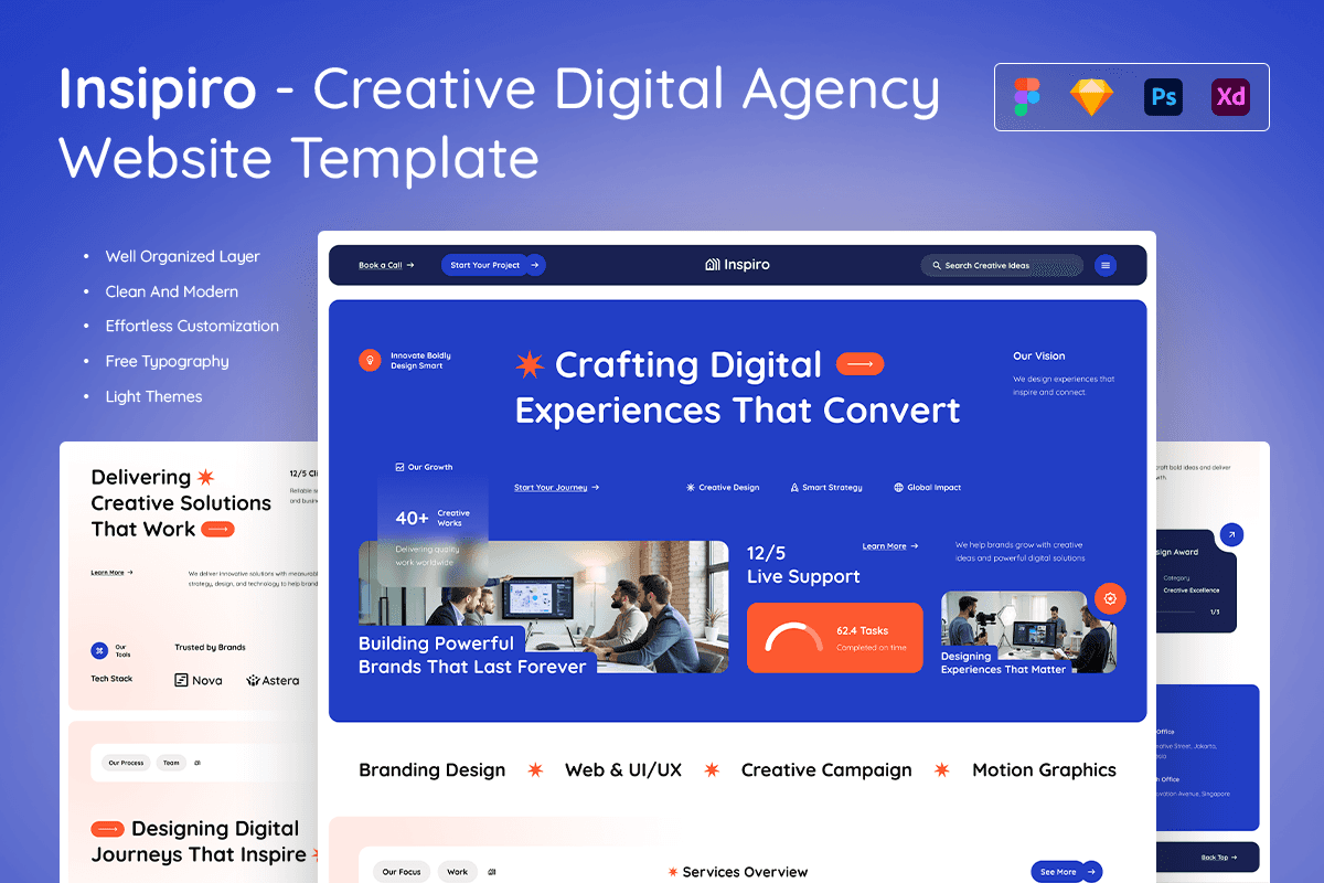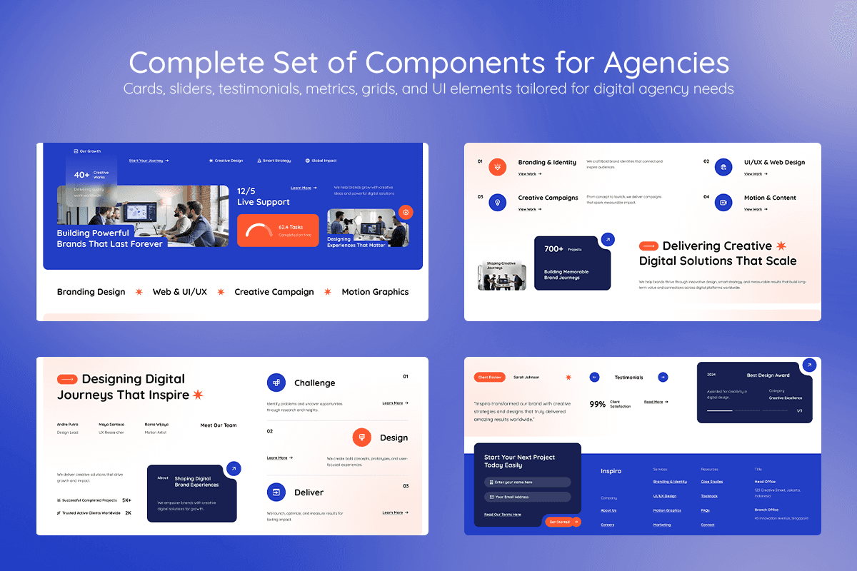 Inspiro is a vibrant creative digital agency website template crafted for studios that design impactful brand experiences across web, UI/UX, campaigns, and motion content. With its bold color palette, confident typography, and grid-based layouts, the template delivers a dynamic yet professional presence that feels contemporary and client-focused. Each section is thoughtfully arranged to highlight your services, process, tools, and team—while placing real project work and outcomes at the center of the story.