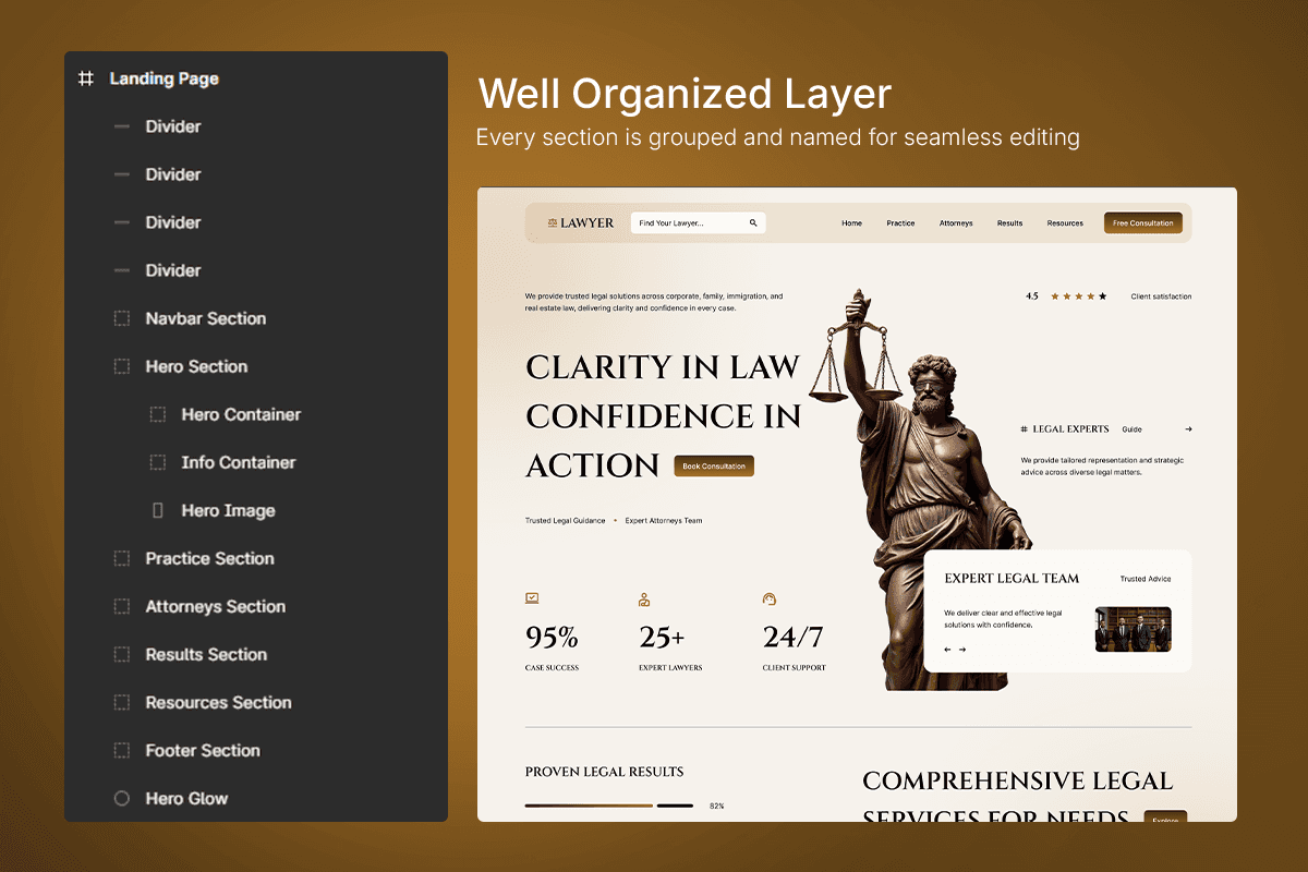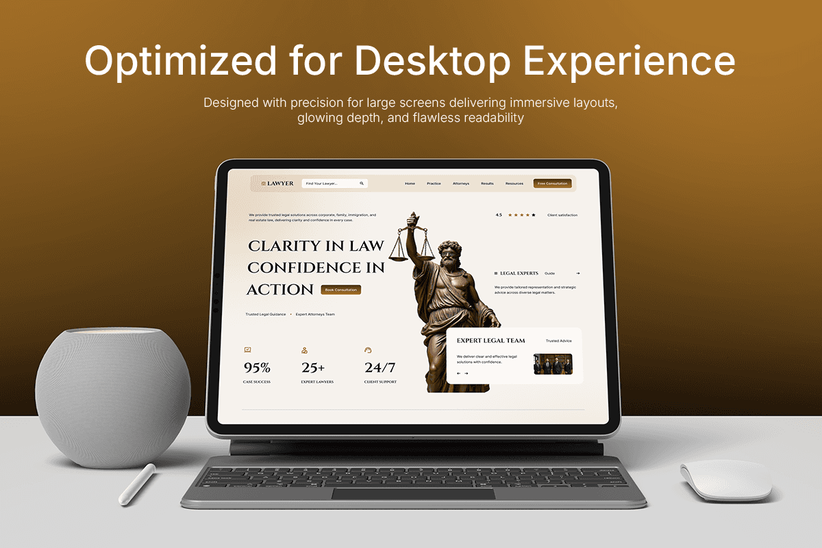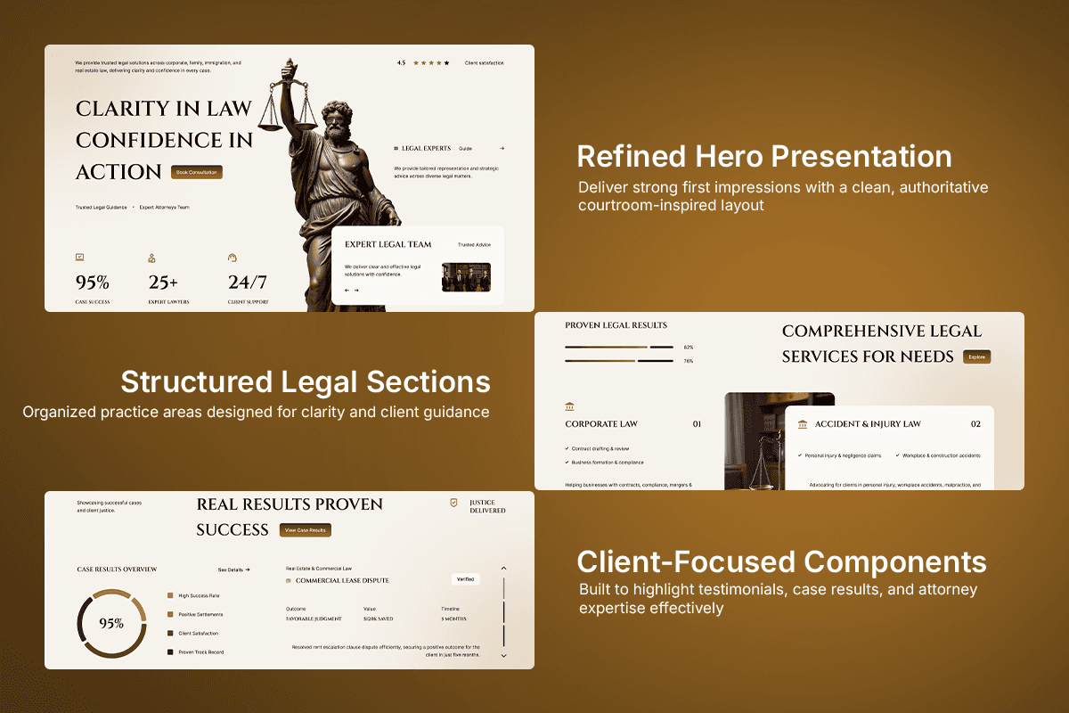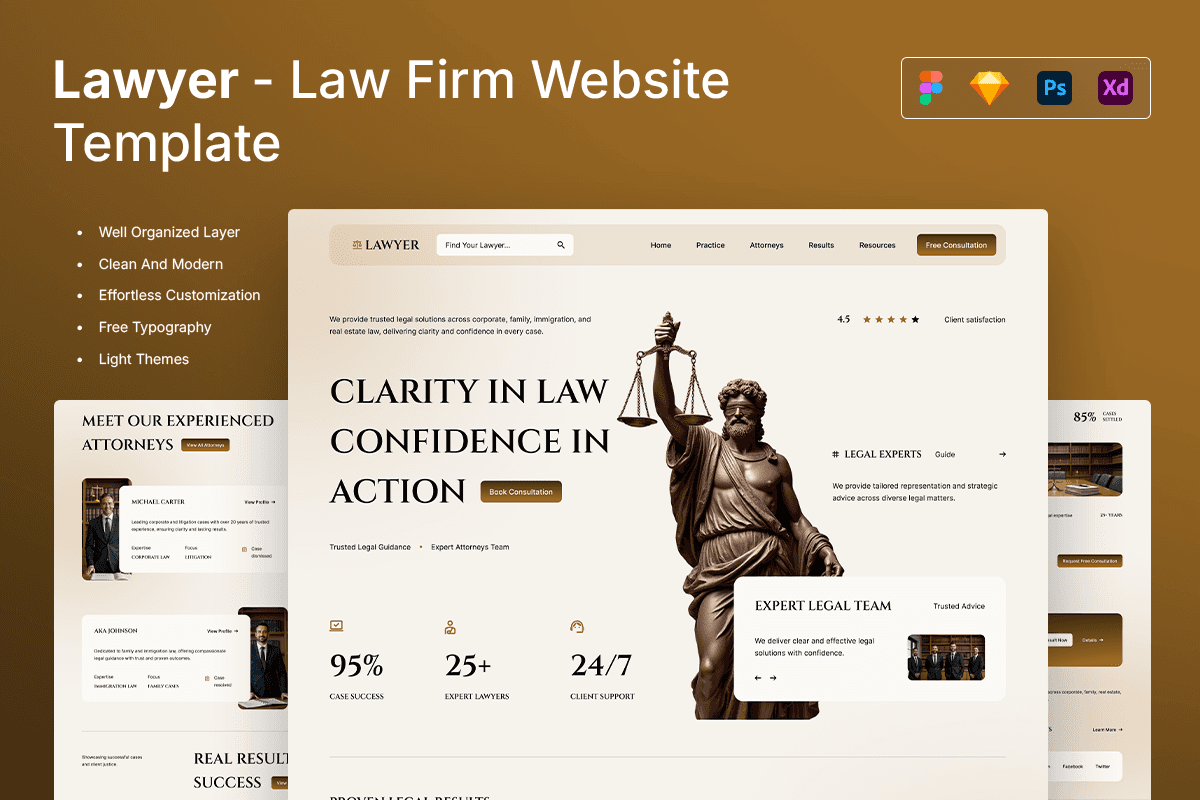Lawyer is a polished law firm website template crafted for legal practices that want to communicate professionalism, trust, and proven results. With its elegant typography, warm neutral palette, and carefully structured sections, the template presents complex legal services in a way that feels approachable and confident. Visitors are guided from key value statements and featured practice areas to attorney profiles, case outcomes, and helpful legal resources—creating a complete and reassuring experience for potential clients.