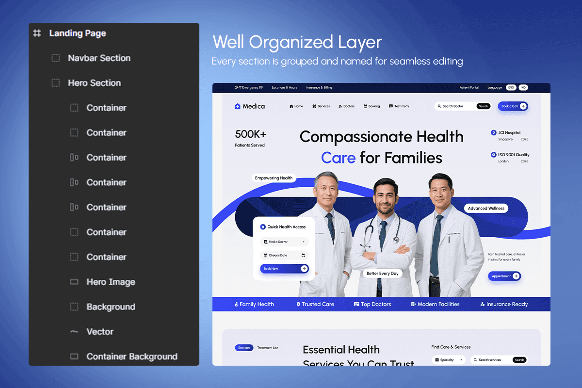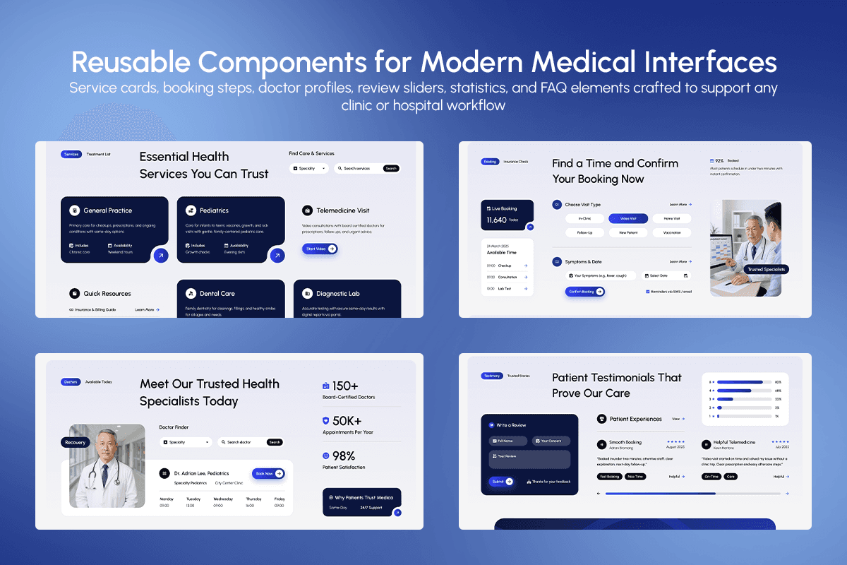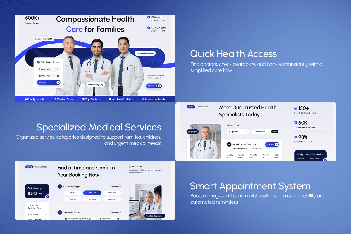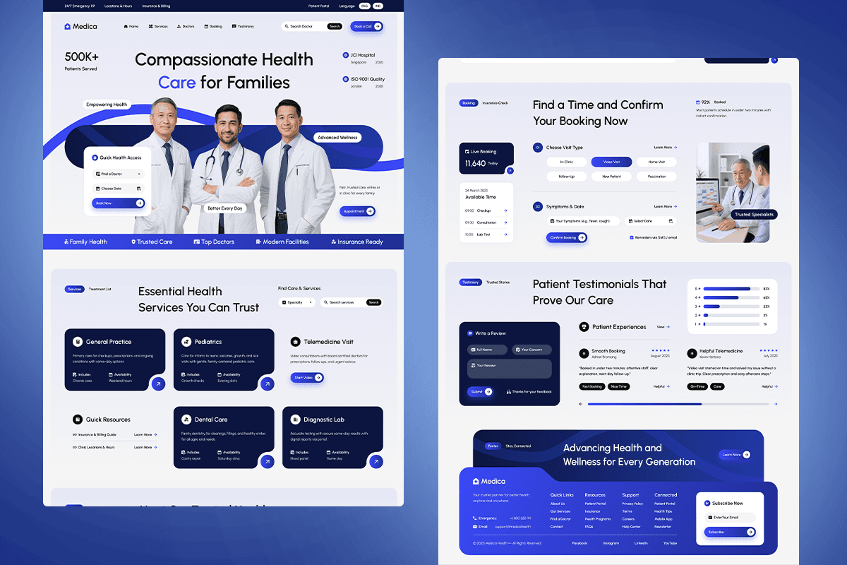 Medica is a warm and professional health care website template crafted for hospitals, clinics, and medical practices that serve families and communities. With its approachable blue palette, clear typography, and human-centered imagery of real doctors and patients, the design immediately communicates trust and care. The layout is structured around the full patient journey: discovering services, finding the right specialist, choosing a visit type, confirming an appointment, and sharing feedback after treatment. Service cards for general practice, pediatrics, telemedicine, dental care, and diagnostics make it easy for visitors to understand available care options, while doctor profiles, schedules, and quick booking buttons reduce friction in getting an appointment. Patient testimonials, satisfaction metrics, and certifications further reinforce reliability, turning Medica into a complete digital front door for your healthcare organization.
