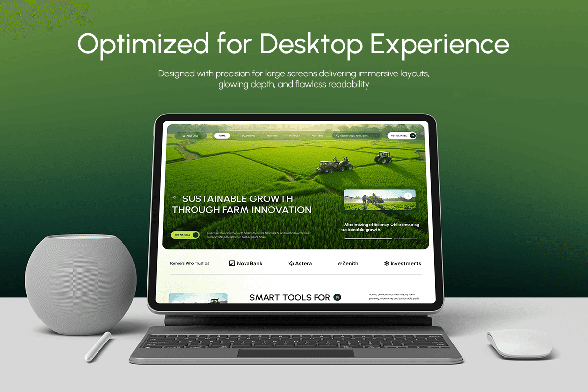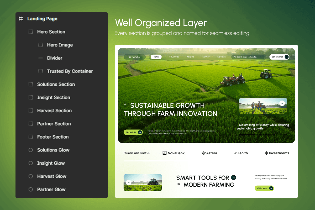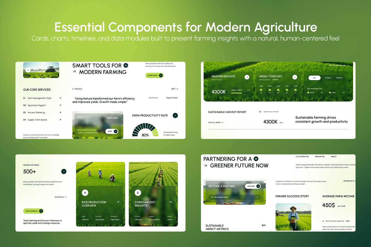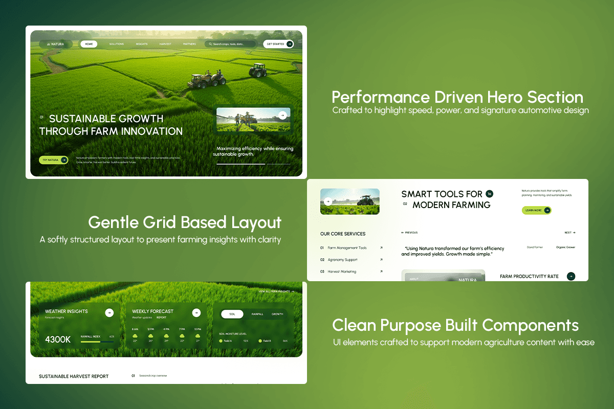 Natura is a clean and modern agriculture website template crafted for agritech platforms, farming cooperatives, and organizations focused on sustainable growth. With wide, immersive field imagery, calm green gradients, and structured data components, this template presents farm solutions in a way that feels professional, trustworthy, and connected to the land.