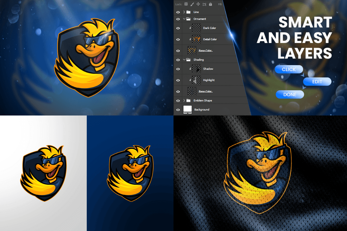 The file is fully layered and neatly organized, allowing effortless customization of colors, highlights, shadows, and ornamental details to match any branding style. Whether placed on jerseys, overlays, banners, or merchandise, Punk Duck delivers a vibrant, professional, and attention-grabbing mascot suitable for both print and digital use.
