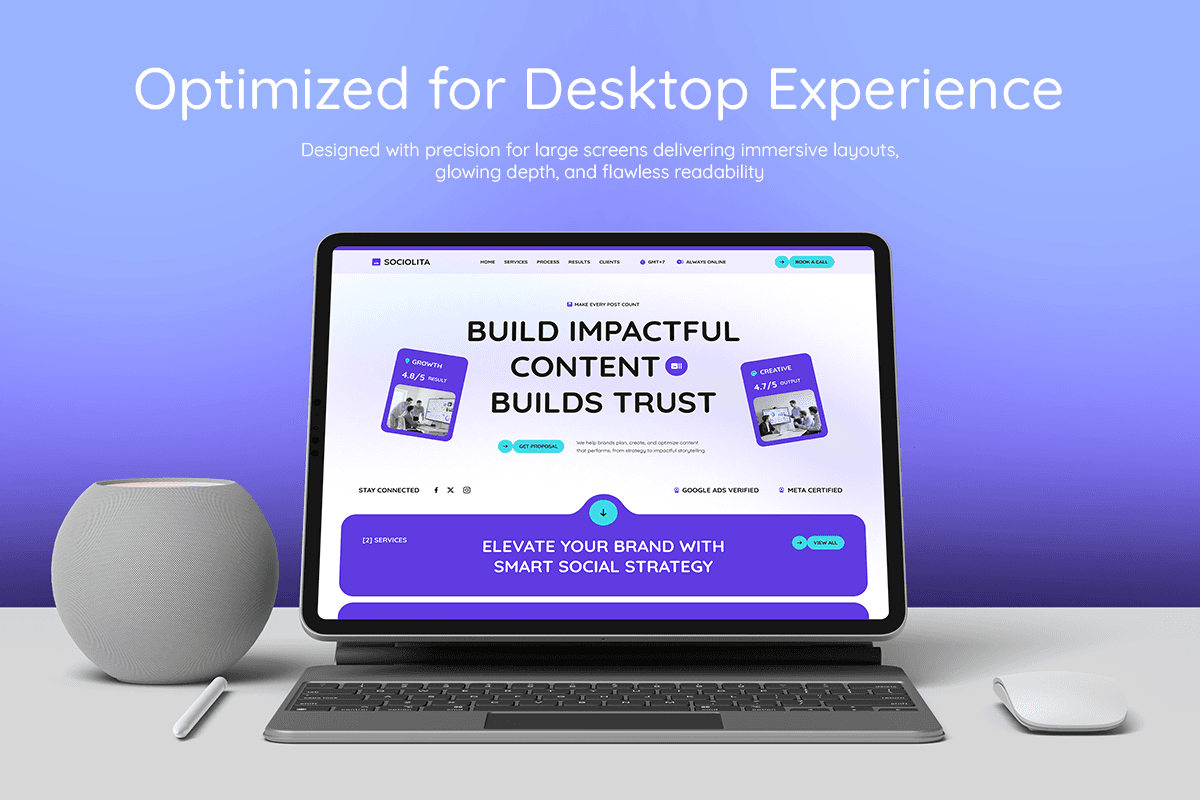 Sociolita is a modern social media agency website template crafted for teams that help brands create content that performs and builds trust. Featuring energetic gradients, card-based sections, and confident typography, the design delivers a fresh, digital-native look that feels both creative and strategic. The layout is structured around what agencies need most: clear service offerings, step-by-step campaign processes, analytics-backed results, and relatable client testimonials—making it easy for prospects to see exactly how you work and what outcomes you deliver. From content and creative services to paid social marketing and influencer campaigns, Sociolita keeps the focus on growth metrics, engagement performance, and long-term client partnerships.