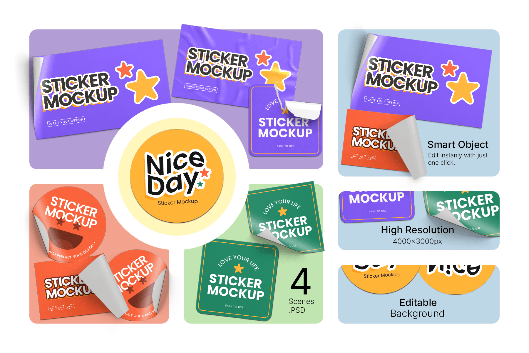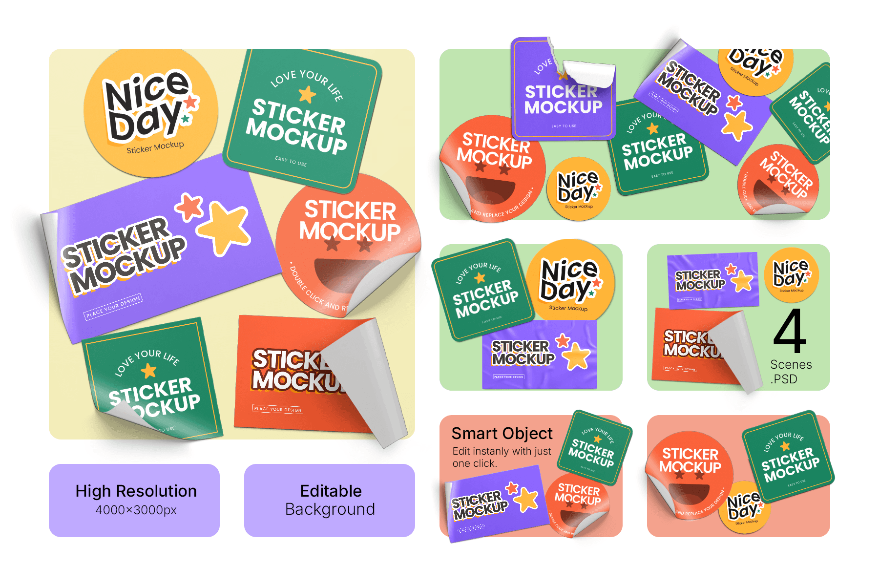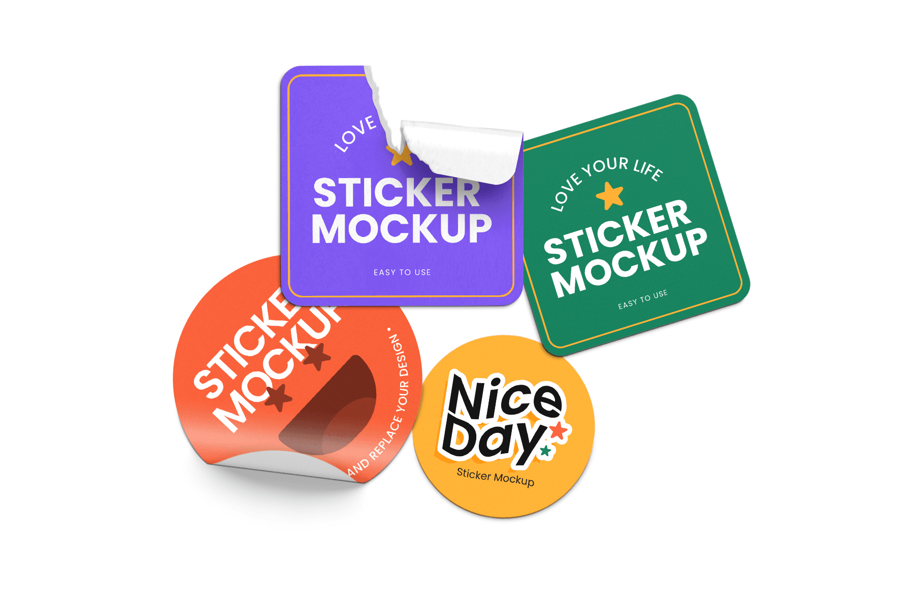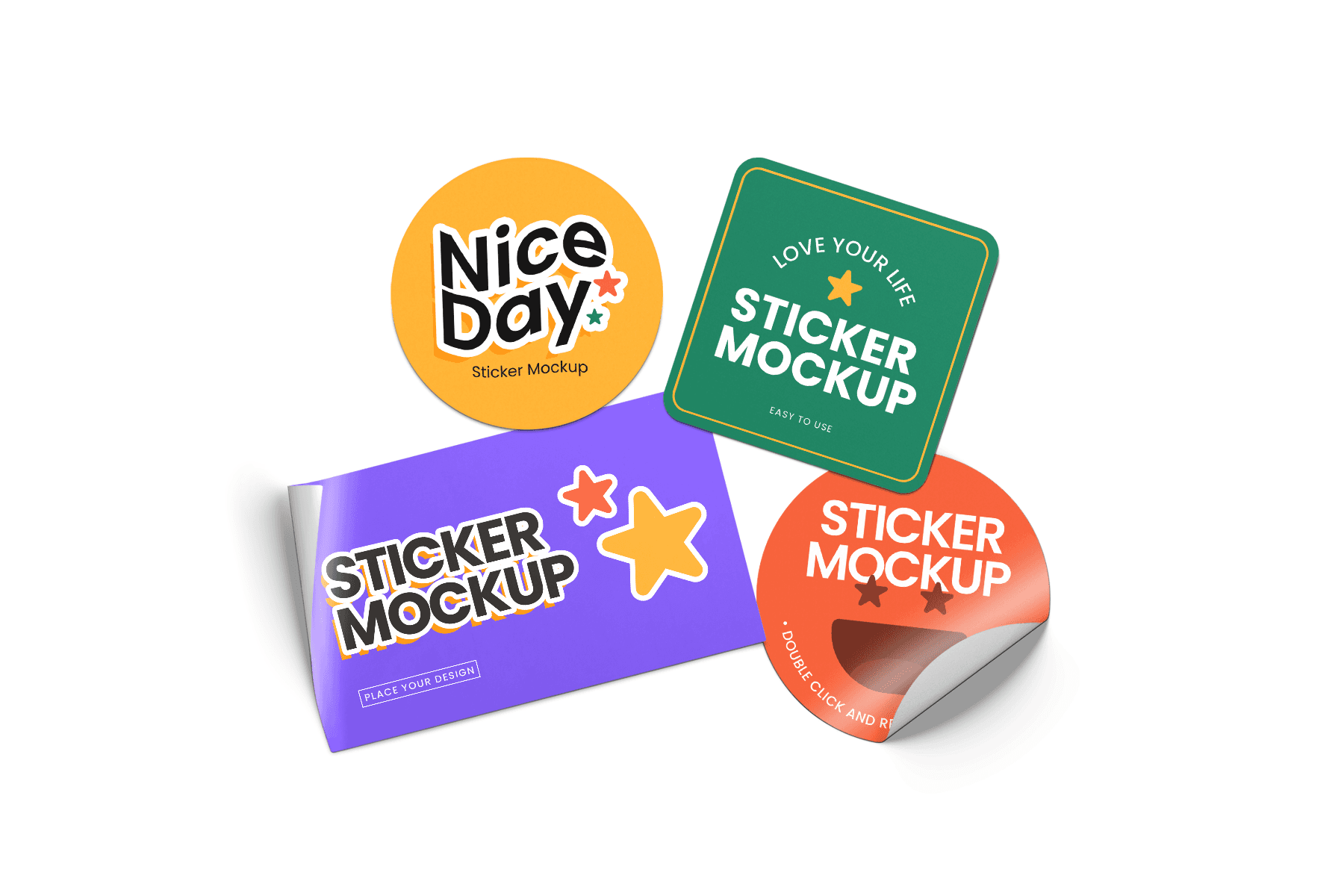 Sticker Mockup is a vibrant and modern mockup collection designed to help you present your sticker designs in a professional, yet playful way. Featuring multiple shapes round, square, and rectangular along with curled, peeled, and wrinkled variations, this set brings your artwork to life with realistic shadows and highlights. The bright color palette and clean white background make your design stand out, ideal for showcasing logo stickers, typography decals, character illustrations, or promotional graphics. With easy-to-edit Smart Objects and well-organized layers, you can place your artwork in seconds and create polished visuals for portfolios, client presentations, social media, or product listings.