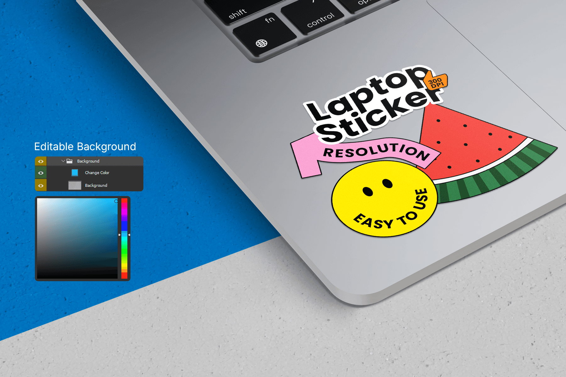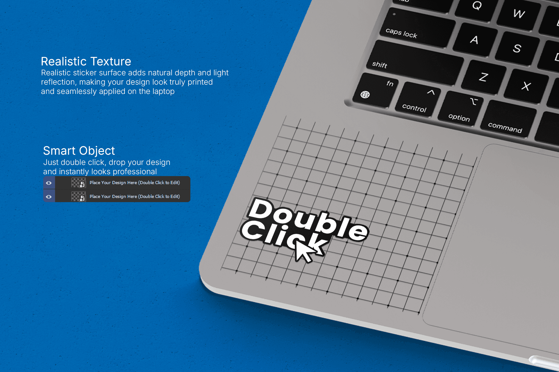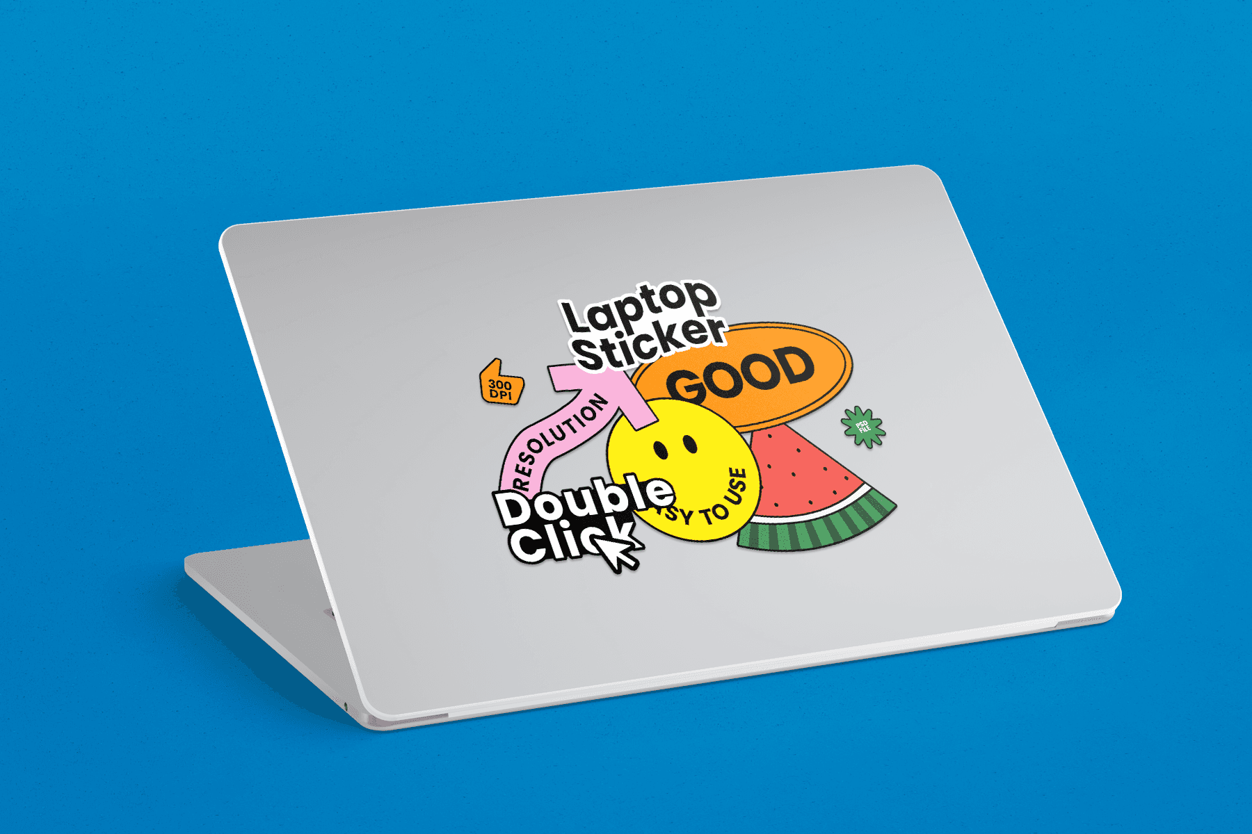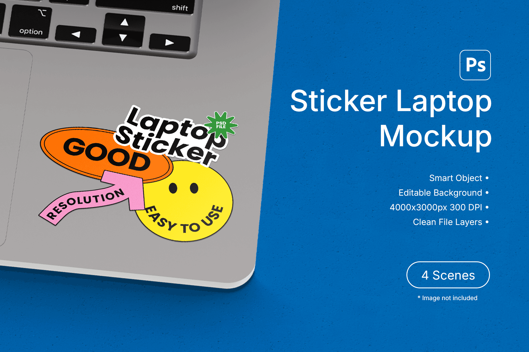 Sticker Laptop Mockup is a high resolution mockup set designed to present your sticker designs in a fresh, modern workstation environment. Placed on a sleek aluminum laptop with a vibrant blue background, your artwork becomes the hero, ideal for showcasing logo stickers, illustrator packs, or custom merch concepts. Multiple scenes highlight different sticker clusters and placements around the trackpad and on the laptop lid, giving you flexibility for various compositions. With easy Smart Object editing and clean, organized layers, you can drop in your design, keep the natural shadows and reflections, and export polished visuals for portfolios, client presentations, e-commerce, or social media.