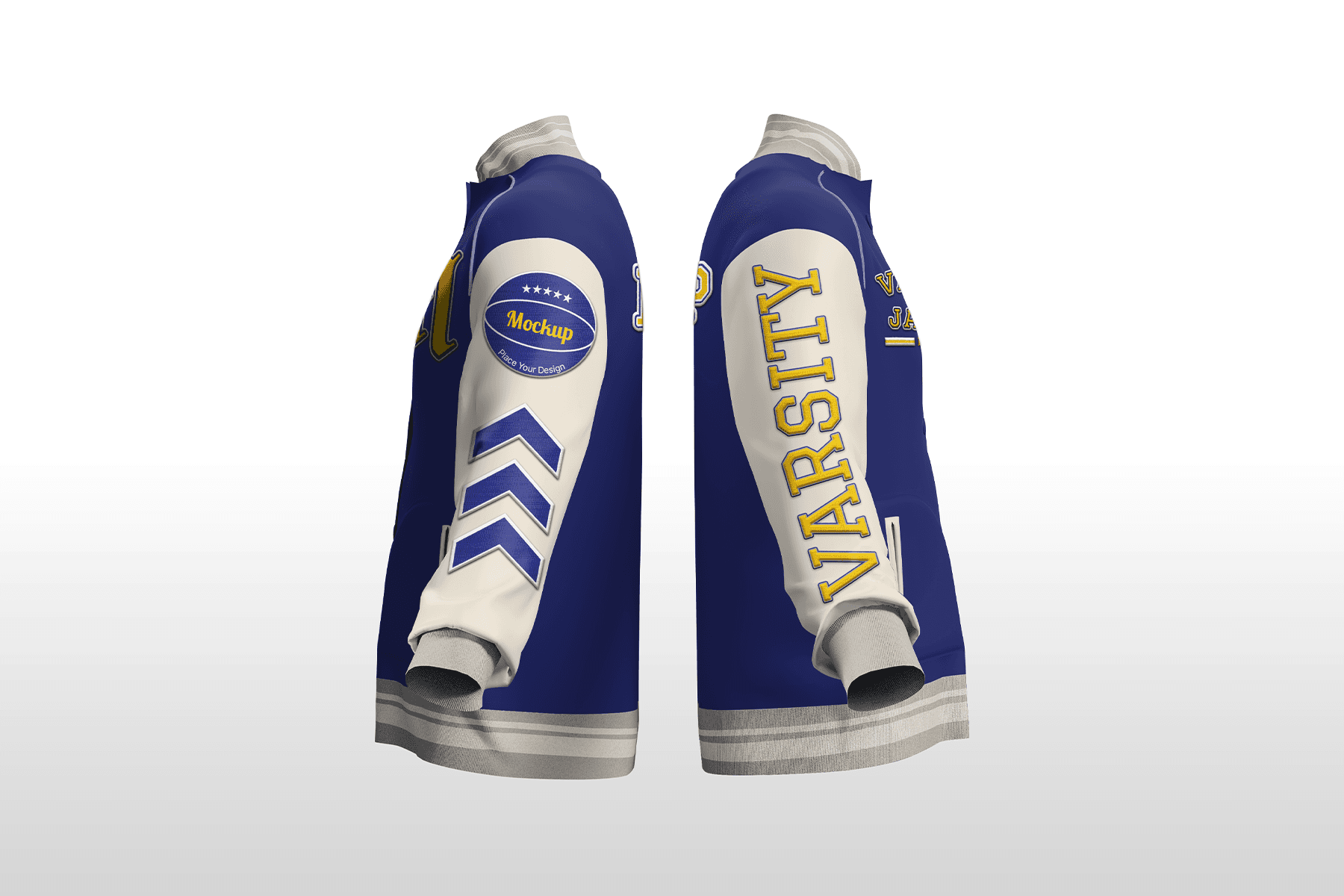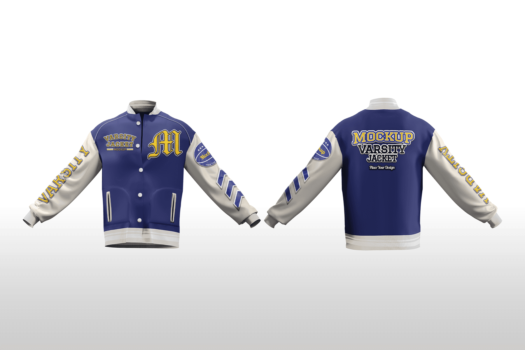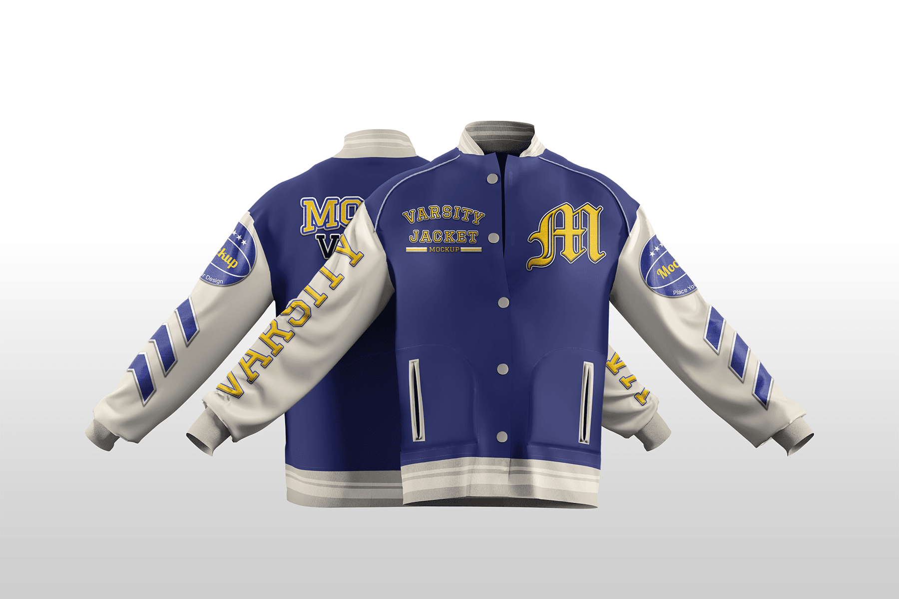 Varsity Jacket Mockup is a premium, high–resolution mockup designed to present your letterman and college jacket designs in a polished, professional way. Featuring full front and back views with outstretched sleeves, it’s ideal for displaying chenille patches, embroidered logos, sleeve badges, and bold typography graphics all at once. The realistic fabric texture, ribbed cuffs, and subtle shading create a true-to-life look, while the clean gradient background keeps the focus on your artwork. With Smart Object layers and customizable colors for body, sleeves, trims, and details, you can quickly adapt the jacket to any school, team, or brand identity and export ready-to-use visuals for online stores, catalogs, or client presentations.