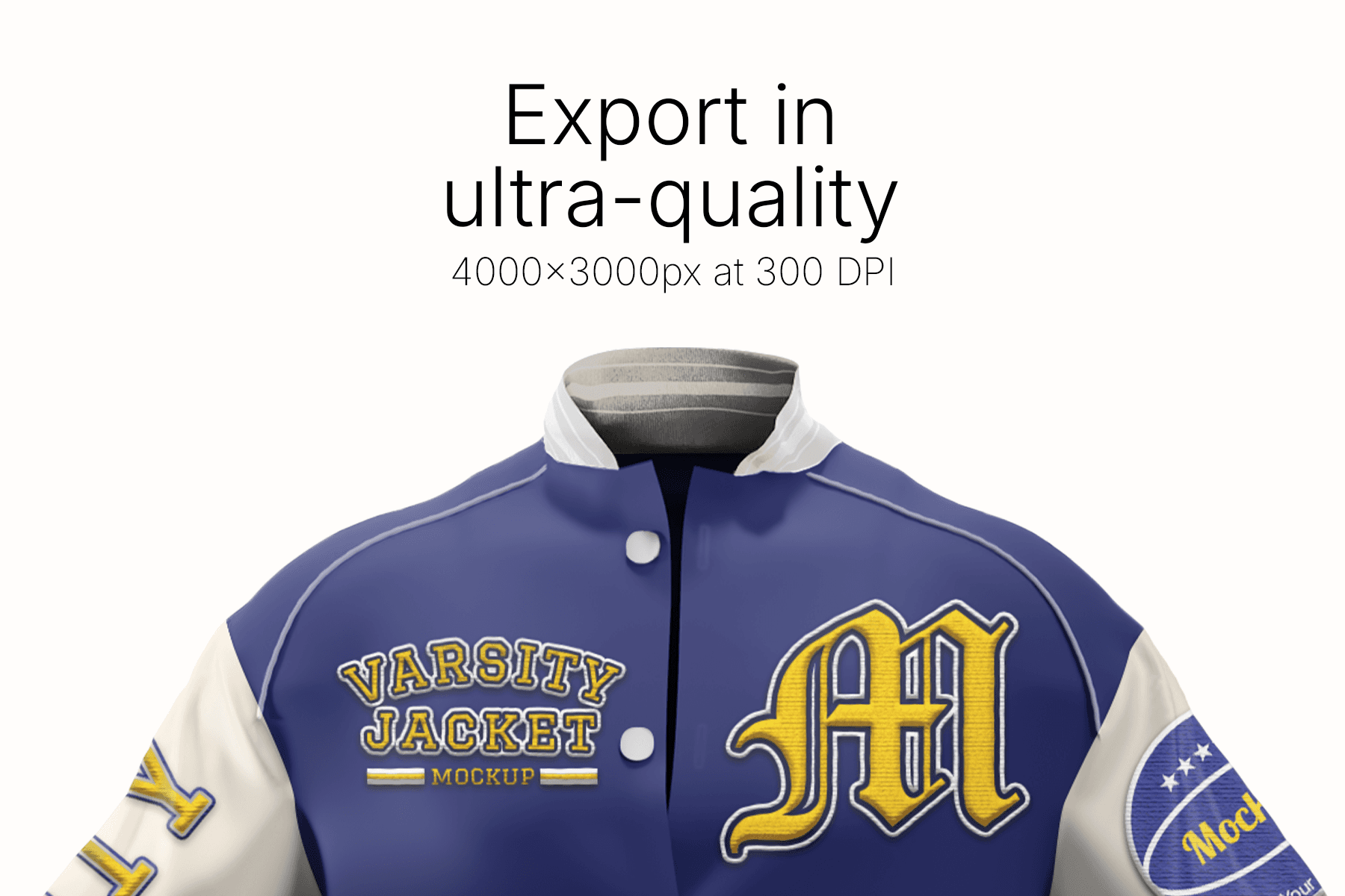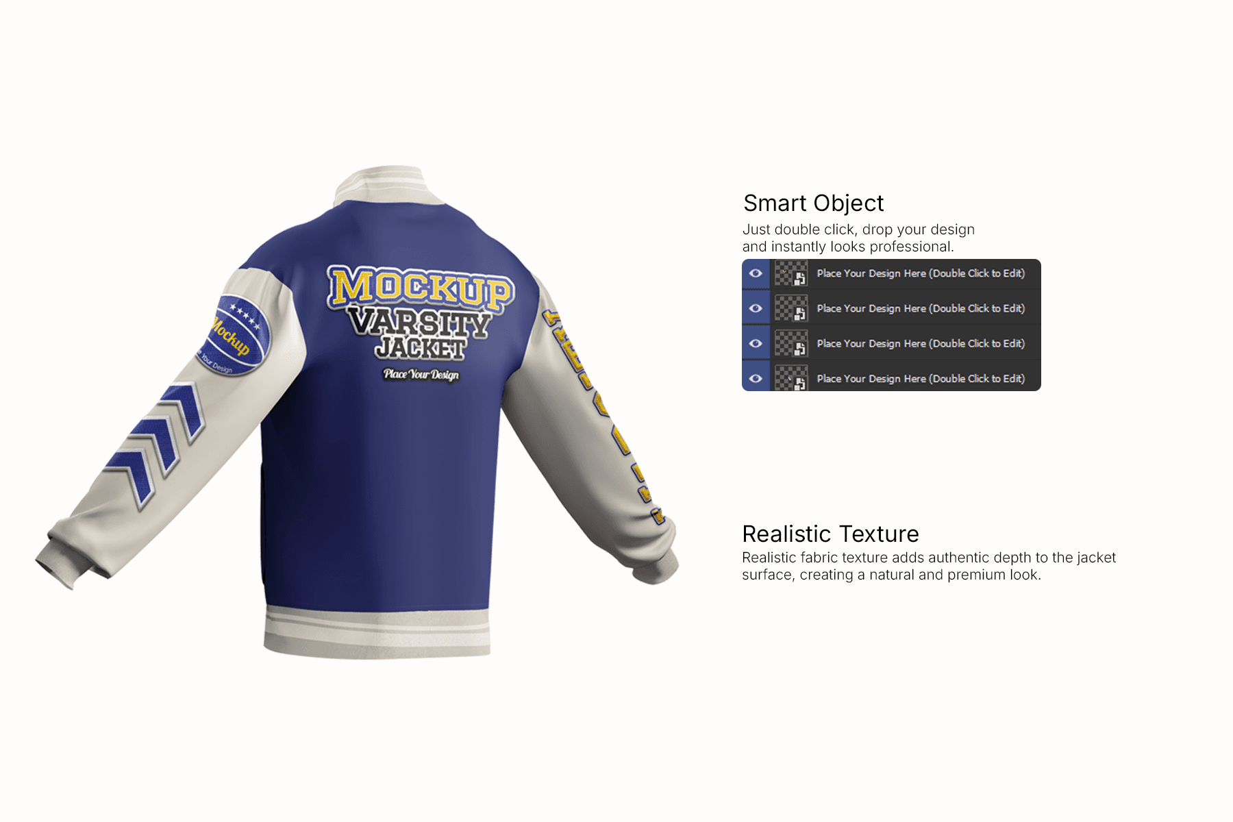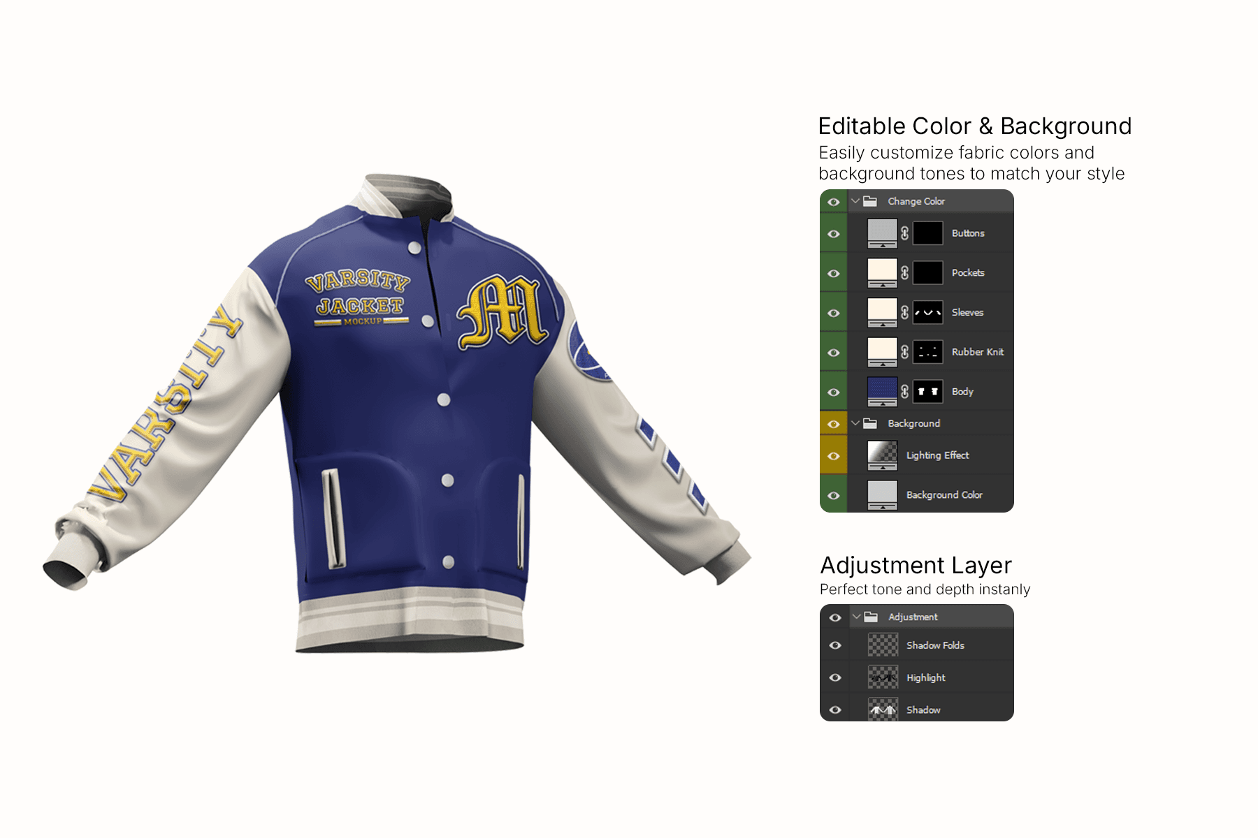 Varsity Jacket Mockup is a premium, high–resolution mockup designed to present your letterman and college jacket designs in a polished, professional way. Featuring full front and back views with outstretched sleeves, it’s ideal for displaying chenille patches, embroidered logos, sleeve badges, and bold typography graphics all at once. The realistic fabric texture, ribbed cuffs, and subtle shading create a true-to-life look, while the clean gradient background keeps the focus on your artwork. With Smart Object layers and customizable colors for body, sleeves, trims, and details, you can quickly adapt the jacket to any school, team, or brand identity and export ready-to-use visuals for online stores, catalogs, or client presentations.